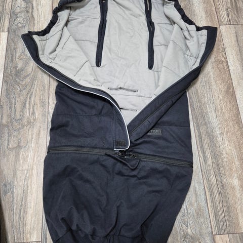 Birmabag varmepose i grå og oransje farge. Designet for utendørs bruk med slitesterkt materiale og justerbare stropper. Passer for ulike temperaturforhold og aktiviteter. Fungerer som en varmepose og har vært helt uvurderlig for oss, da barna kan klare seg med langt tynnere bekledning ved bruk av Birnabag. Skjermer barna for vær og vind og holder dem varm.