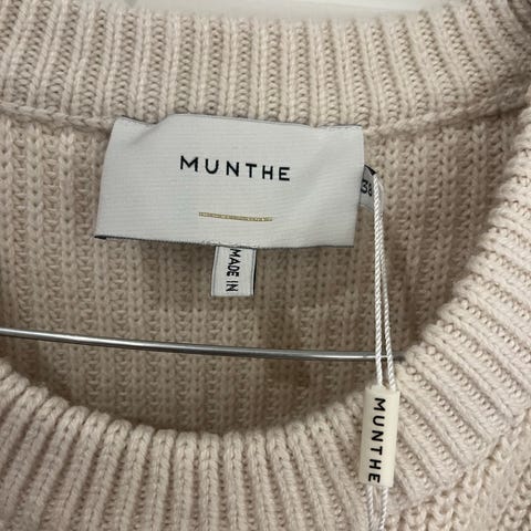 Munthe genser i ull, flerfarget, størrelse 36 for kvinner. Genseren har stripemønster i flere farger og er laget av ullmateriale.den er helt ny, men har ikke lapp.