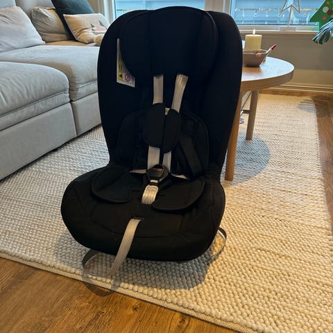Denne har ikke iso-fix og festes ved hjelp av beltene i bilen. Forankringsseler medfølger.
