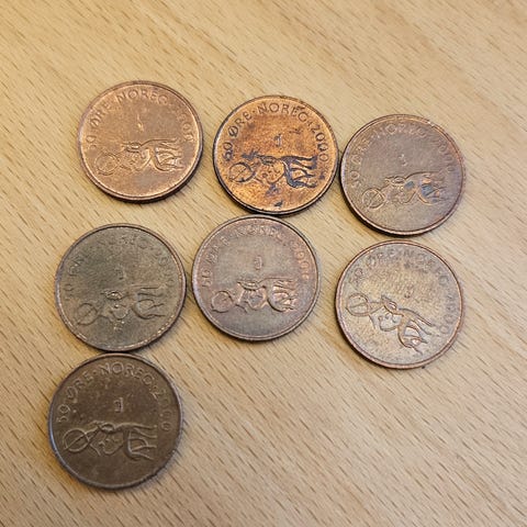6 stk 1 kr sølv Sverige fra 1928, 1947, 1960, 1961, 1962, 1966 Totalt 40 gr 400 S