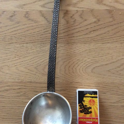 Tinnøse fra Askvoll Brug. 33cm lang 10 cm diameter på selve øsa.