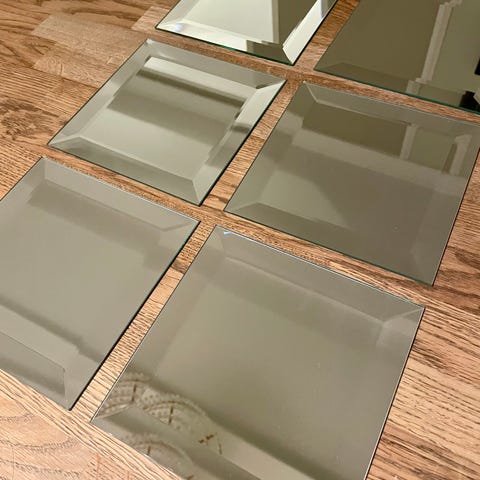 9 stk. fasettslipte speilfliser i størrelse 10x10 cm. Flisene har en skrå kant og kan brukes til dekorasjon eller som speilelementer på vegg eller andre overflater.