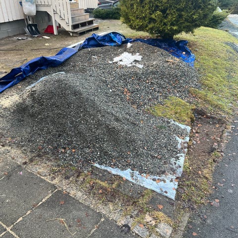 Steinen ligger på en garasje og er klar for henting.