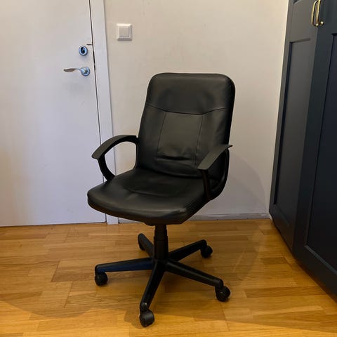 Kontorstol med sete i svart stoff og rygg i nettingmateriale.Egnet for bruk ved skrivebord og kontorarbeid.