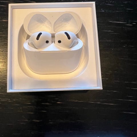 Apple AirPods trådløse hodetelefoner i hvit farge. Leveres med ladeetui og original emballasje. Designet for trådløs tilkobling og enkel bruk.