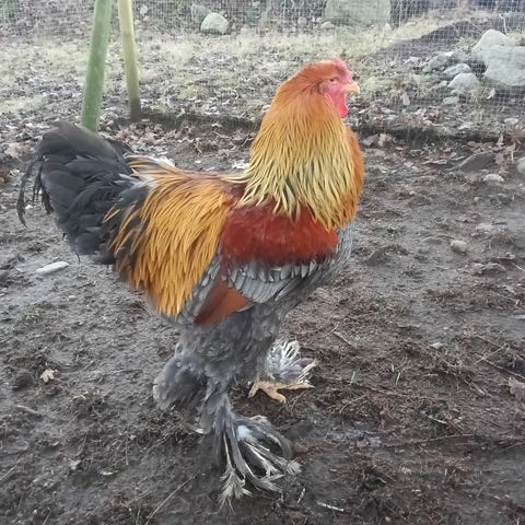 Ca 6-7 mnd gammel flott Brahma hane søker nytt hjem. Går ikke sammen med den andre hanen lenger, litt for liten flokk for 2 haner( 4 stk).