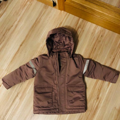 H&M jakke i størrelse 110 for jente, laget av polyester. Jakken har rosa farge og er utstyrt med hette med pelsdetalj. Den har glidelås og knapper foran, samt lommer med klaff.