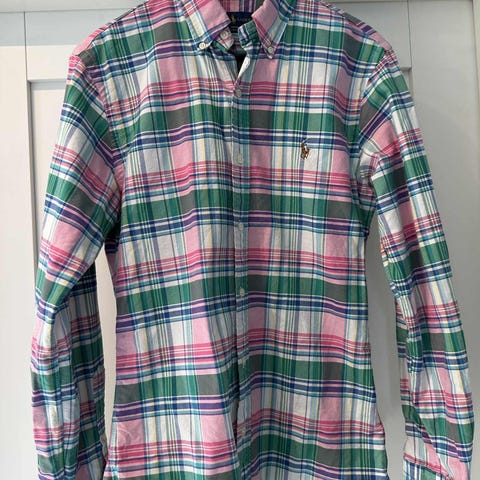 Ralph Lauren Slim Fit skjorte i størrelse S. Skjorten har et flerfarget rutemønster og er designet for menn. Materialet er ikke spesifisert. Passer til formelle og uformelle anledninger.