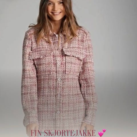 Jakken er rosa og har en strukturert overflate med dekorative knapper. Den har en rund hals og to brystlommer med klaffer. Jakken passer til ulike anledninger.