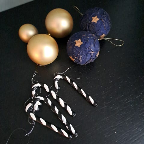 Gir bort to julepotter. Røde med glitrende mønster i gull. Pottene er ca 10 cm høye, ca 13 cm brede på toppen og litt over 9 cm brede på bunnen.