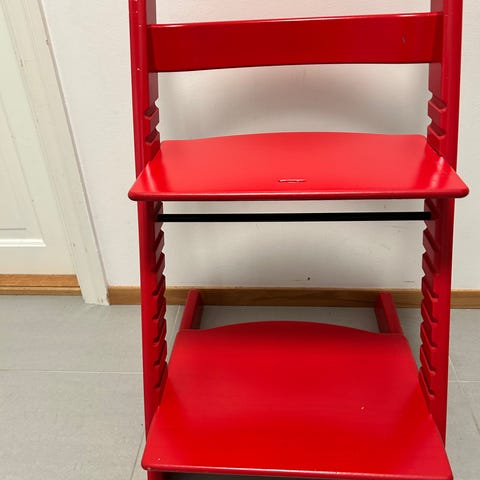 Stokke Høy barnestol i hvit tre. Barnestolen er designet for å gi god støtte og komfort for barn under måltider og aktiviteter. Den har justerbare sitte- og fotplater for å tilpasses barnets vekst. Stolen har noen bruksmerker og mindre slitasje, som vist på bildene. Ekstra sikkerhets støtte på bein.