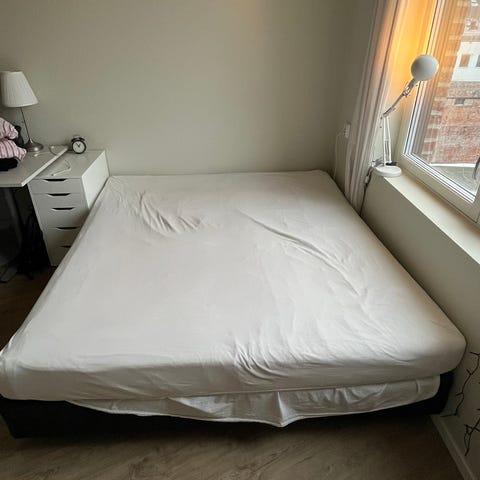 Pent brukt rammemadrass fra IKEA selges. Madrassen har treben og det følger med en tynn overmadrass. På bildet har jeg lagt til en ekstra overmadrass men den følger ikke med.