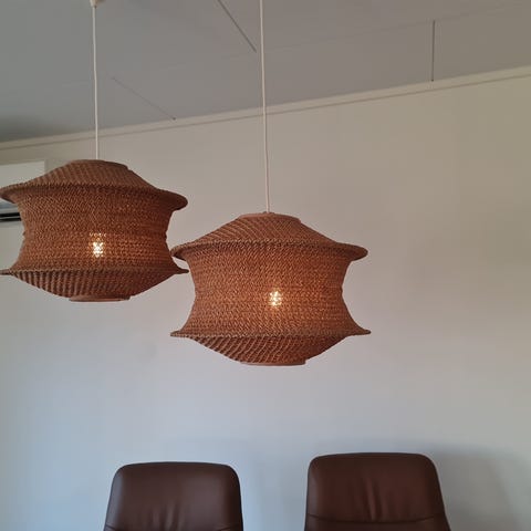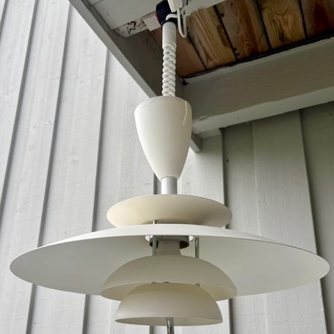 Liten hvit lampe som ligner PH-pendel. God kvalitet. Kjøpt for å henge i vindu. Lampen har en diameter på 18 cm og høyde 8 cm. LED lampe. Ledningen har støpsel og er 3.80 m. lang. Bryter 1m. fra støpsel. Produksjon: BELID, Sverige.