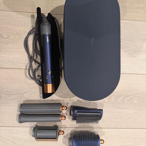 Dyson Airwrap Complete hårstylingssett med flere børste- og stylingtilbehør. Inkluderer etui for oppbevaring, ulike børstevedlegg og stylingverktøy, designet for å style hår med luftstrøm uten ekstrem varme.