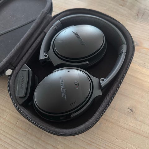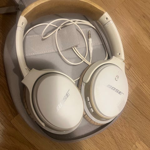 Trådløse Bose hodetelefoner i grå farge med over-ear design. Hodetelefonene har polstrede øreputer og justerbar hodebøyle. Denne er noe slitt, se bilde Leveres med etui for oppbevaring.