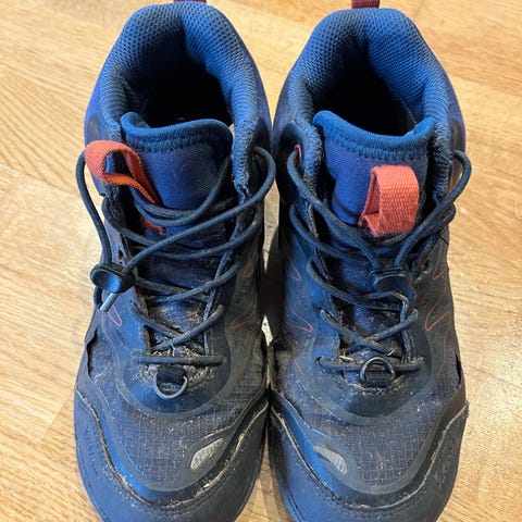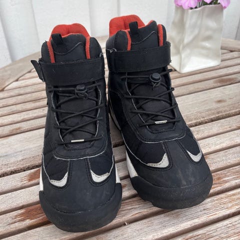 Viking barnesko i størrelse 34, unisex. Skoene er svarte med godt mønster på sålen for grep. Passer til barn og kan brukes til ulike utendørsaktiviteter.