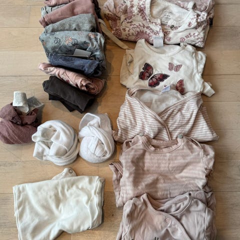 Pent brukt klespakke i bomull, med 6 bodyer, 3 bukser, to strømpebukser og en søt cardigan. Klærne er bl.a. fra H&M, Reflex og P.o.p. Sendes eller hentes på Montebello. Se også mine andre annonser med babytøy ☺️.