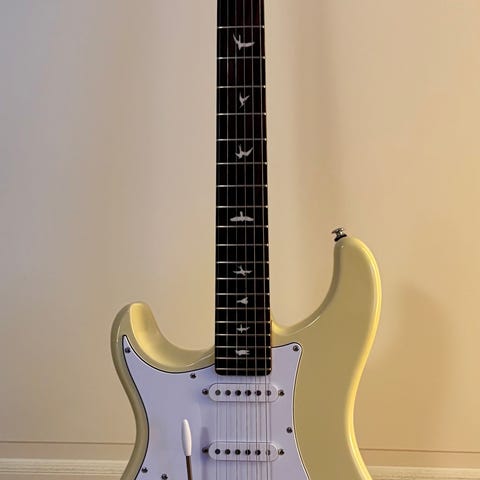 Pen PRS SE Starla selges. Spiller bra med en lav action. Ingen båndslitasje. Har to PRS DS-02 humbucker pickuper som kan coil splittes for en nydelig single coil lyd. Noen små nesten usynlige riper på plekterbrettet, men ingen merker eller dings. Vekt er kun 3,1 kg.