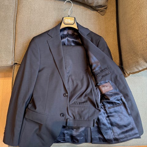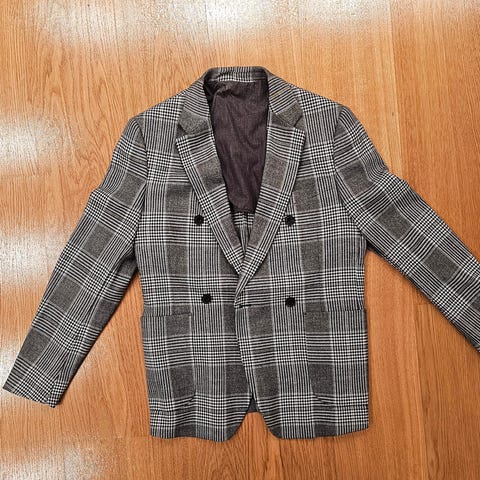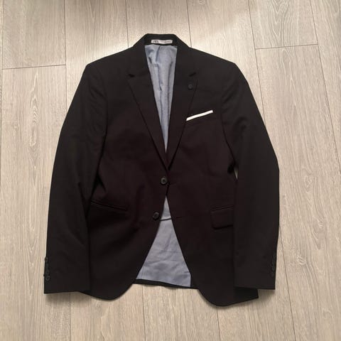 Zara dressjakke for herre i størrelse 44 - 46 Jakken er svart og laget av polyester. Den har en dobbelspent knappelukking.