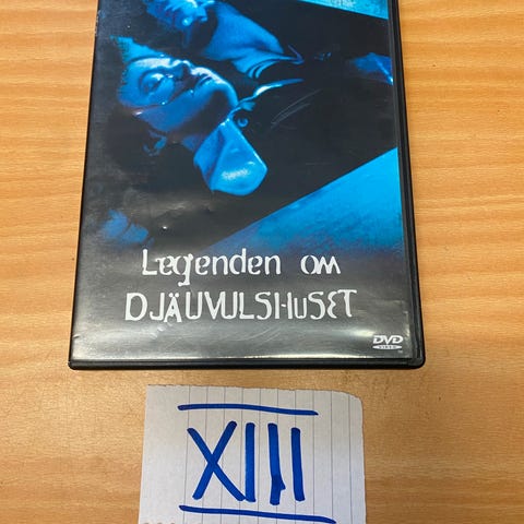 Legenden om Djävulshuset DVD med filmcover i blått og svart. Produktet er en DVD-utgivelse av filmen med samme navn. Svensk utgivelse