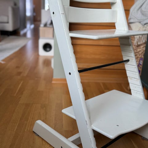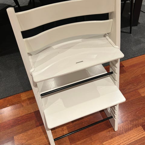 Stokke Høy barnestol laget i tre. Justerbar sitte- og fotplate for tilpasning til barnets størrelse. Designet for barn med fokus på ergonomi og funksjonalitet.