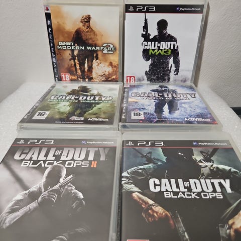 Call of Duty spillpakke for Playstation 3 som inkluderer 7 spill. Call of Duty: Modern Warfare 2, Call of Duty: Black ops 2, Call of Duty: Black Ops, Call of Duty: Black Ops II, Call of Duty: Modern Warfare 3 og Call of Duty 4: Modern Warfare. Spillene leveres i original emballasje med disk og manualer, unntatt Call of Duty black ops 2 den ligger i en MW3 beholder som er litt knekt.