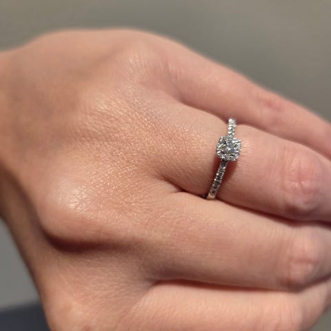 Selger min Clara diamantring i 375 hvitt gull med 0,25 ct diamanter, kjøpt ny hos Gullfunn (nypris ca. 9 499 kr)