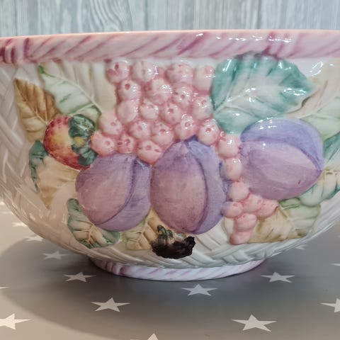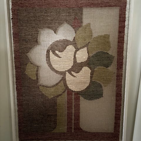 Dekorativ og stemningsfull veggklokke fra 1960-tallet, Materiale antas å være keramikk og tre og vakre blomstermotiver.