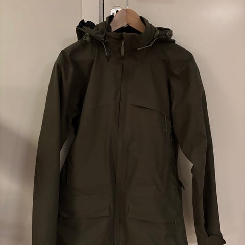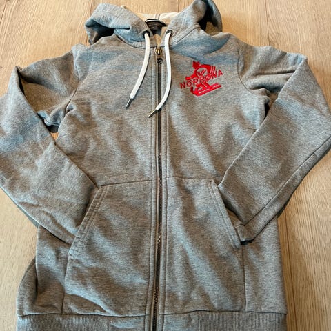 Norrøna hettejakke i størrelse M. Genseren er grå og laget i materialer som gir komfort og funksjonalitet. Den har glidelås foran og hette med snøring.