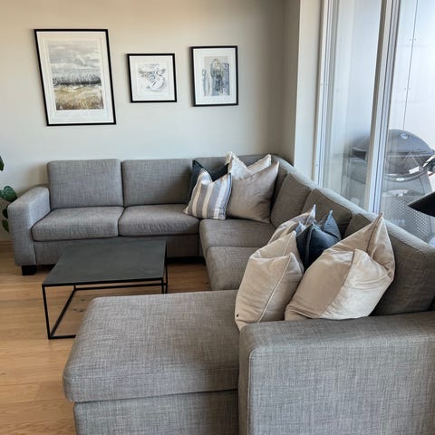 Selger en moderne hjørnesofa fra Møbelringen i grå farge, perfekt for deg som ønsker både varme og stil i stuen. Sofaen er romslig, har behagelig sittekomfort og myke puter – ideell for familier eller for deg som liker avslappende kvelder hjemme. Dekorative puter i ulike farger og mønstre følger med og gir ekstra karakter til rommet.
