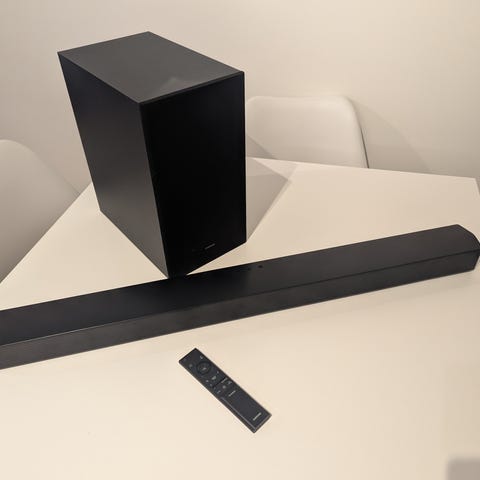Samsung lydplanke i svart farge. Produktet inkluderer fjernkontroll for enkel styring av lydinnstillinger.