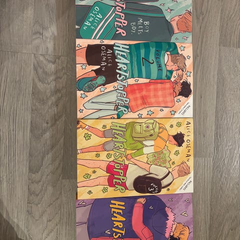 Desse er heartstopperbøkna er knapt brukt og er teikneserie samt som ganske lettlesne. Dei er på engelsk så ta litt hensyn til det🫡