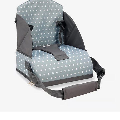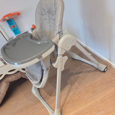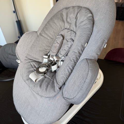 Kinderkraft barnestol med grå polstring og hvit ramme. Stolen har innebygde funksjoner for musikk og vibrasjon, samt sikkerhetssele for barnet.