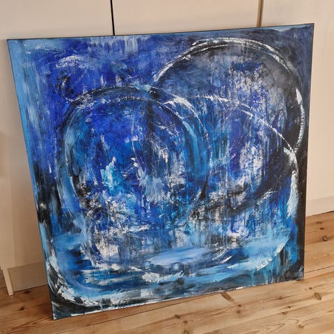 Verket har et rolig, moderne uttrykk med organiske former i blåtoner – perfekt for deg som ønsker et kunstverk som skaper harmoni i rommet uten å ta for mye oppmerksomhet.