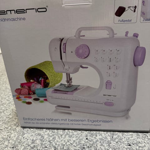 Emerio symaskin i hvit og rosa farge. Maskinen har flere funksjoner for søm og er egnet for ulike tekstilprosjekter.
