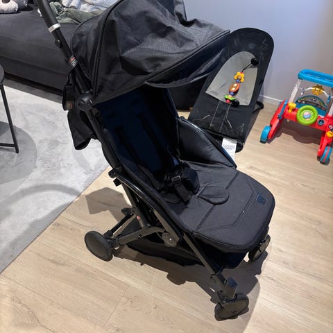 Super vogn å ha med på reise da den kan fraktes som håndbagasje på fly og får plass i hattehyllen. Den har fotstøtte og full liggestilling. Regntrekk og sekk følger også med.