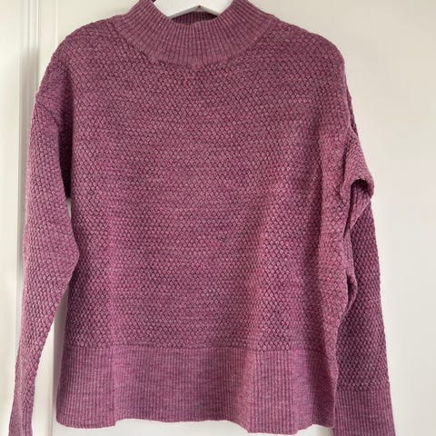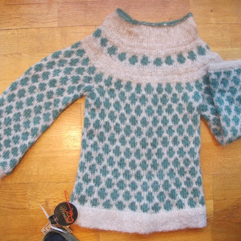 Selger en nydelig hjemmestrikka villmarksgenser i mykt ullgarn.