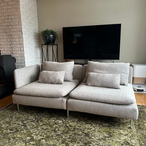 Sofaen kommer med begge armlenene, men kun den ene er festet på da sofaen har vært satt sammen med en annen 3-seter med hjørnemodul og åpen ende.