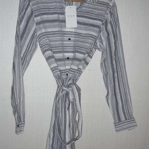 Vila hverdagskjole i størrelse 44 for kvinner. Kjolen er beige og laget av viskose. Den har lang erm og belte i livet. Tilsvarer 40/42 i str