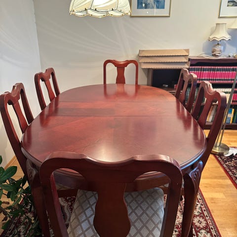 Selger spisebordet vårt kjøpt på Bohus eller Skeidar, inkl 5 stoler + innleggsplate på 50 cm.