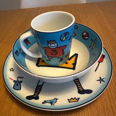 Prins servise med tallerken, dyp tallerken og kopp fra Porsgrunn. Det er et merke i glasuren som har vært der hele tiden er ikke hakk.