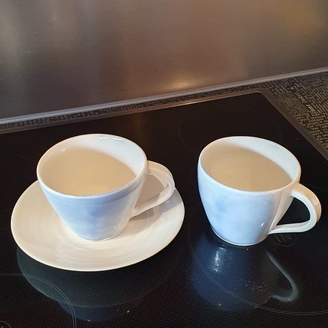 Keramikk krus med dekorative mønstre i grønn og svart farge. Krusene har en robust hank og en ujevn, håndlaget overflate. Passer til drikkevarer som kaffe eller te.