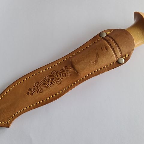 Skaftet er laget av Rosetre, og det er en full tang kniv.