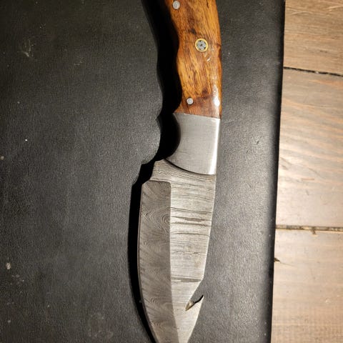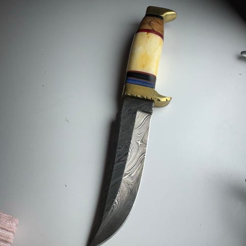 Selger en fin håndlaget Damascus jaktkniv, kniven er 23 cm lang , bladet er 11 cm langt.