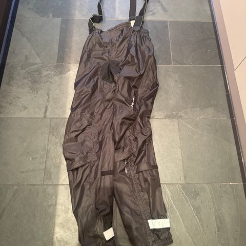 Pent brukt sykkelregnbukse med bib og bortelåser ved bena. Noe slitt oppe ved sele-festet(se bilde).