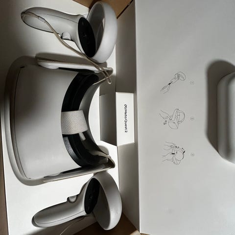 Pent brukt Meta/Oculus Quest 2 VR-headset med to håndkontrollere, ladekabel og ekstra tilbehør. Hodesettet er hvitt med justerbar stropp og designet for trådløs virtuell virkelighet. Passer til bruk med ulike VR-applikasjoner og spill.
