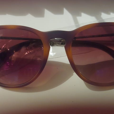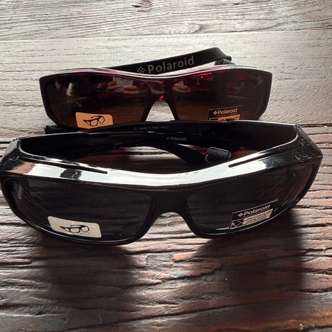 Polariserte solbriller fra kvalitetsmerket polaroid (barnestørrelse). Brillene har en lilla ramme og mørke glass. Brillene er nesten ubrukt og glasset har ingen synlige riper