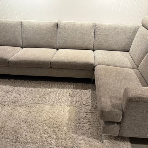 Selger sofa med puter, teppe og puff. Kjøper må hente og transportere bort møblene. Kan selges hver for seg.