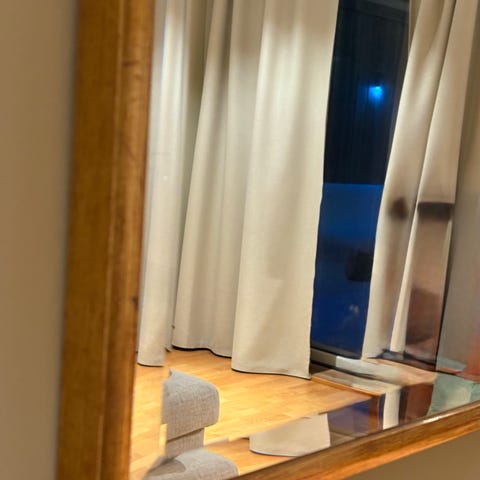 Pent og tidløst veggspeil med treramme, produsert av Mindor Glass Speilfabrikk (senere kjent som Kvams Glass). Speilet har et klassisk uttrykk og solid kvalitet, typisk for norsk håndverk fra perioden.