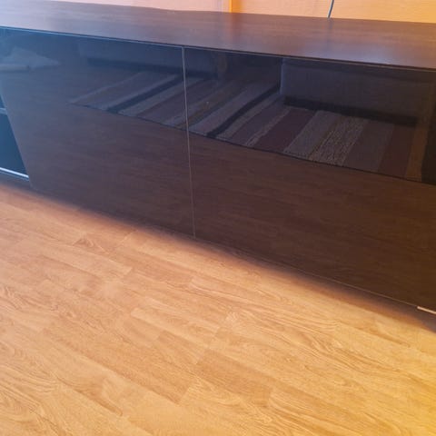 TV-benk i tre med 3 skuffer og åpen hylle. Passer til oppbevaring av elektronikk og tilbehør. Mål og materiale ikke spesifisert.